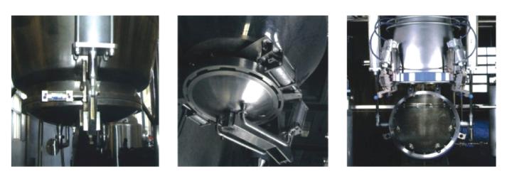 底部出料采用多种出渣门可选装置: 1. 快开保险式出渣门 可自动开闭罐盖,采用了三气缸控制,同时增设有保险装置,防止意外操作,安全系数较高。适合中小型出渣口使用。 2. 旋转式出渣门 全自动开闭罐盖;可以事先高温高压提取,转环式可达到3Bar以上,给提取工艺提供了更多的选择,也可以适应一些特殊的工艺要求,安全可靠,具有充分的安全保障功能、提取罐无泄漏。 3. 大口径出渣门 全自动开闭罐盖;可以实现高温高压提取,给提取工艺提供了更多的选择。此出渣门适合大口径倒锥型提取罐的出渣方式,安全系数高。